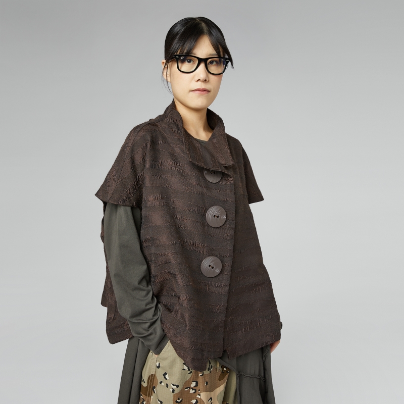 Gilet in tessuto elaborato con piccola percentuale di lana. Chiusura frontale a bottoni a pressione. Spalla calata. Colletto morbido. Linea svasata. Vestibilità ampia e comoda.