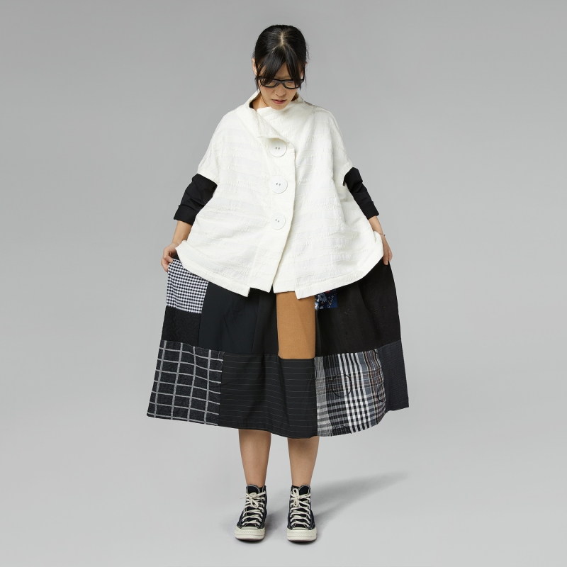 Gilet in tessuto elaborato con piccola percentuale di lana. Chiusura frontale a bottoni a pressione. Spalla calata. Colletto morbido. Linea svasata. Vestibilità ampia e comoda.