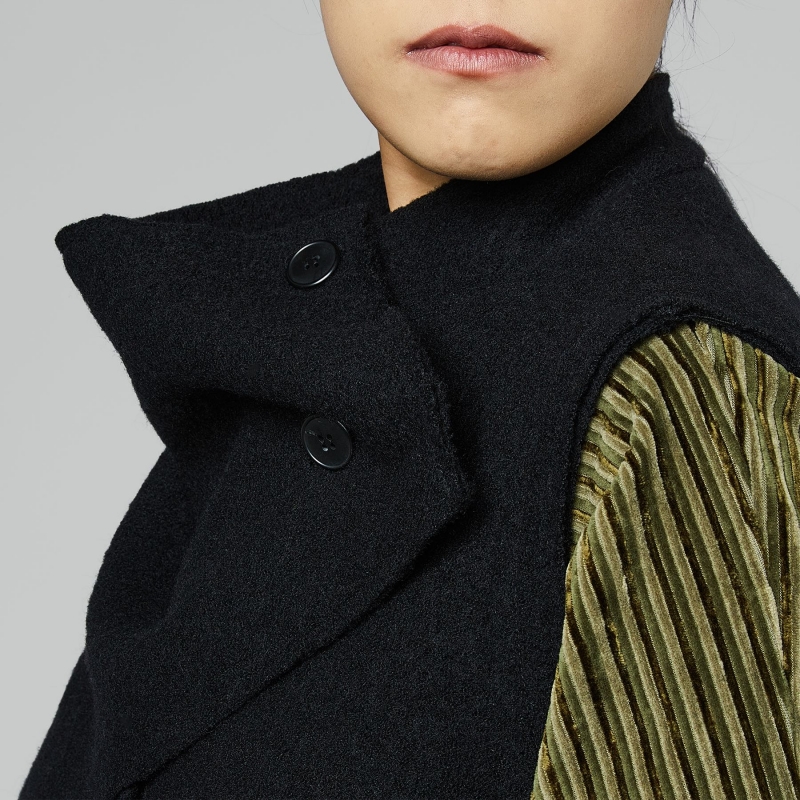 Gilet in lana vergine. Doppia chiusura frontale a bottoni. Effetto collo drappeggiato. Più lungo sul retro. Taglio asimmetrico. Vestibilità calda.