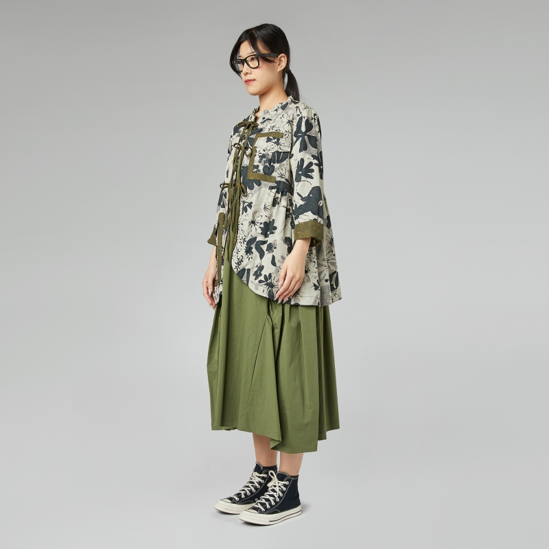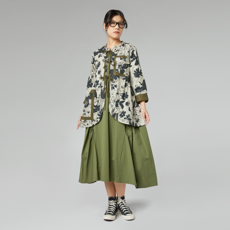 Soprabito in tessuto misto lyocell con stampa floreale. Chiusura frontale a laccetti. Scollo con rouche. Tasche a patta applicate. Spalle regolari e maniche lunghe.
