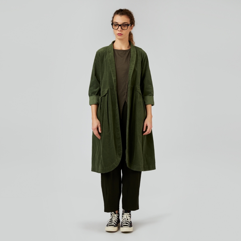 Cappottino in velluto di cotone con collo sciallato, spalla regolare e maniche lunghe. Chiusura frontale a bottone. Dettaglio cucitura in vita con pinces per ampiezza. Tasche laterali inserite nella cucitura. Finte tasche con pattina sul davanti. Taglio svasato. Vestibilità ampia e comoda