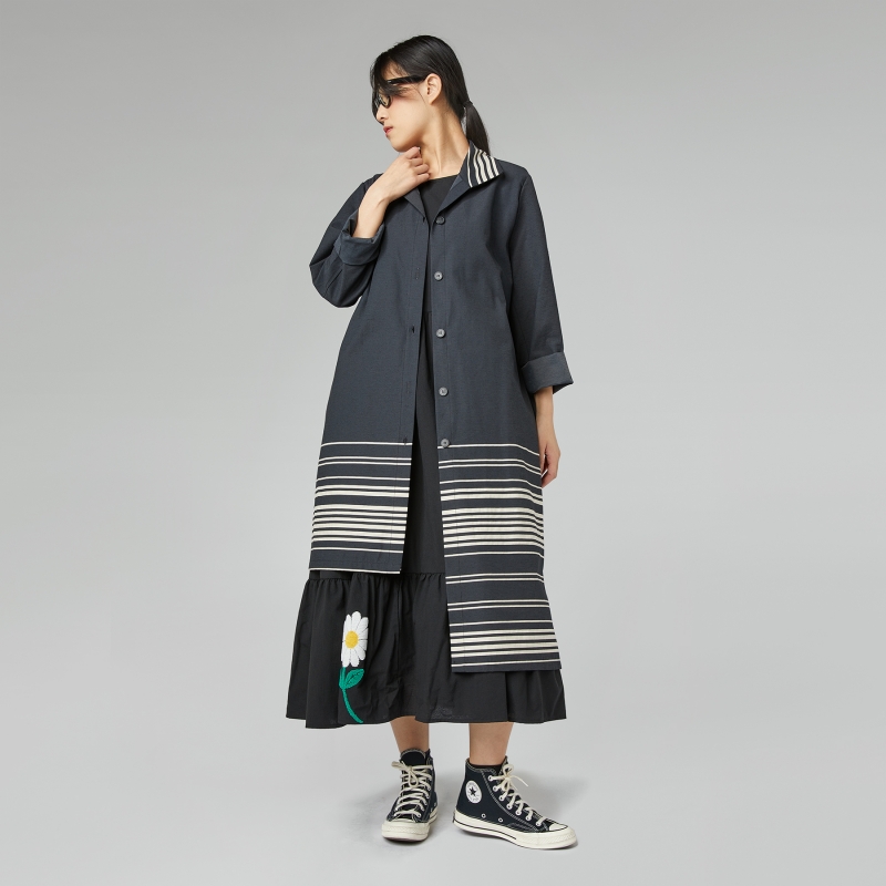 Spolverino a righe sull'orlo e sul colletto. Chiusura frontale a bottoni. Spalla regolare e maniche lunghe. Colletto a punta. Taglio asimmetrico. Tasche laterali inserite nel taglio. Peso primaverile. Vestibilità ampia e comoda.