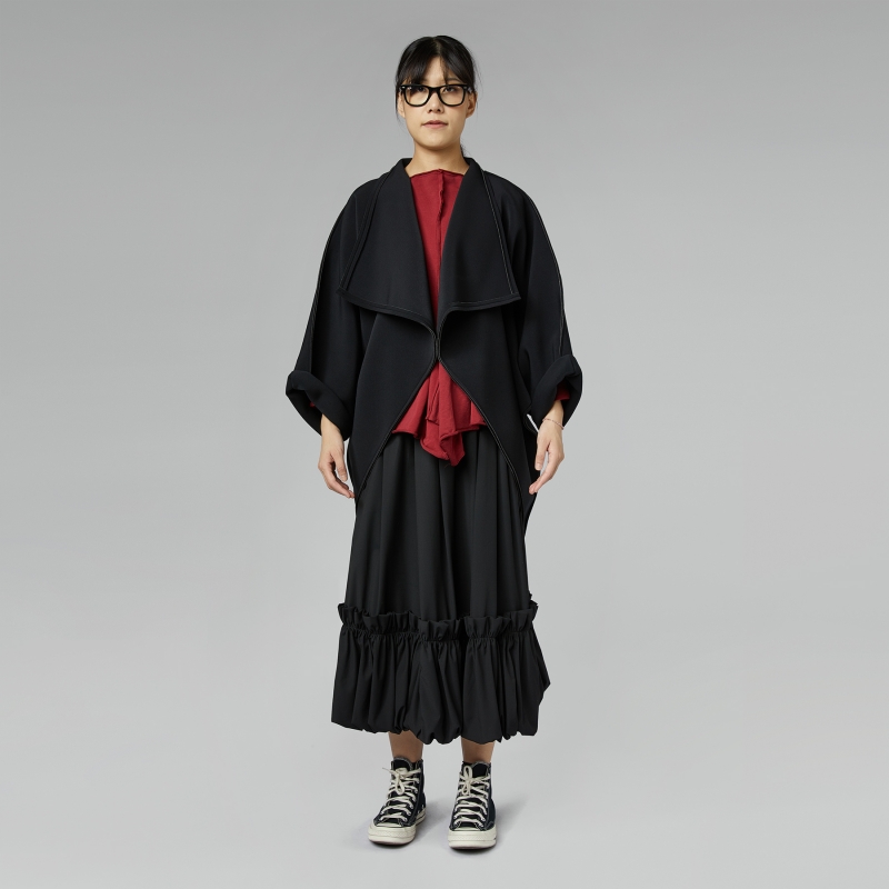 Gonna con orlo a rouche. Fascia elasticizzata in vita con coulisse regolabile. Tasche laterali a scomparsa. Linea svasata. Vestibilità ampia e comoda.