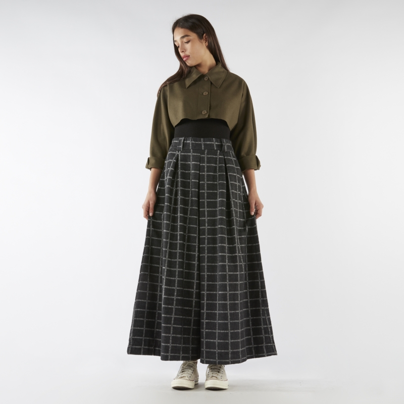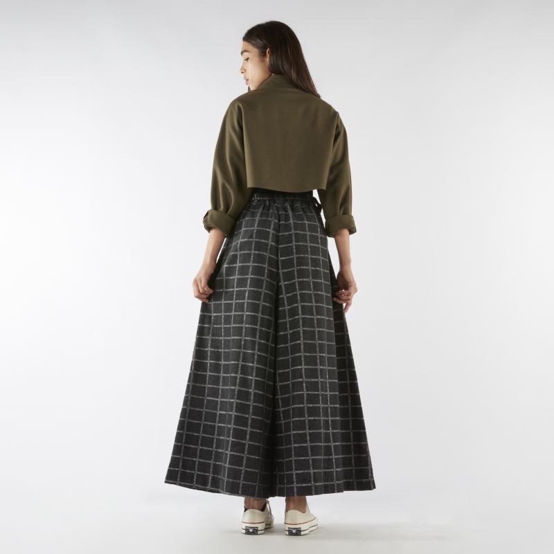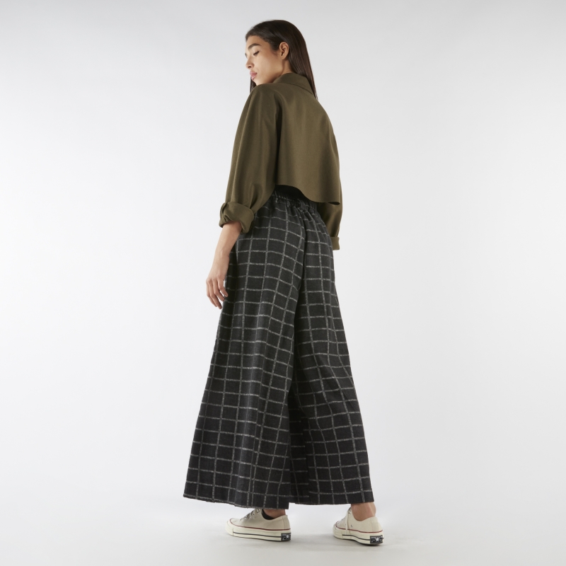 Pantalone palazzo in morbido tessuto misto cotone con fantasia a quadri. Vita alta elasticizzata con passanti per cintura. Tasche laterali nascoste nella cucitura e pieghe baciate sul fronte. Gamba larga. Vestiiblità comoda.