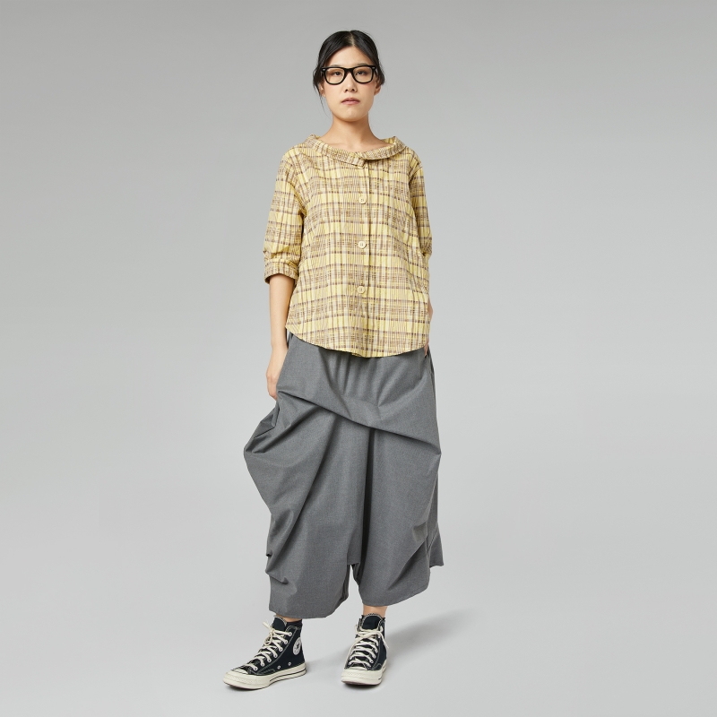 Pantagonna in twill misto viscosa con dettaglio a pieghe. Fascia elasticizzata in vita con passanti. Tasche laterali inserite nel taglio. Cavallo molto basso. Pieghe laterali sulla caviglia. Vestibilità ampia e comoda.