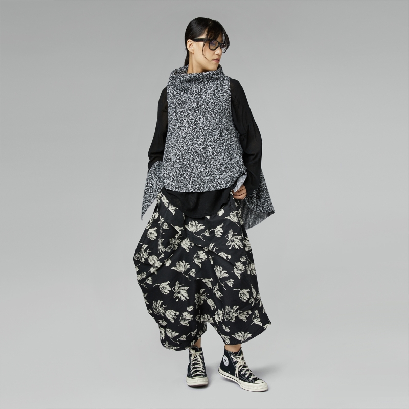 Pantagonna in misto cotone con stampa a fiori. Fascia elasticizzata in vita con passanti per cintura. Tasche laterali inserite nel taglio. Piega frontale. Taglio asimmetrico. Vestibilità cropped e largo.