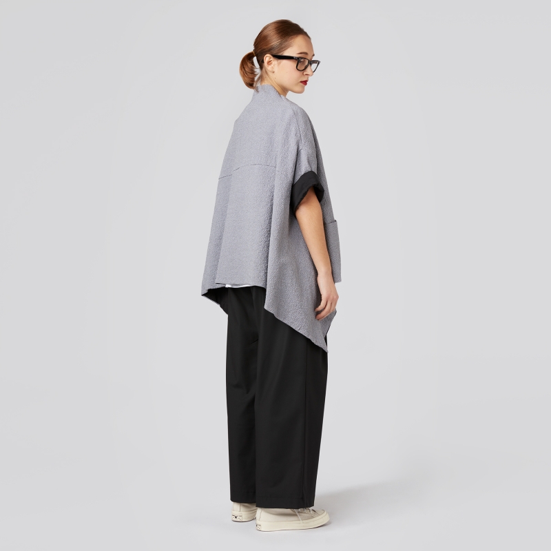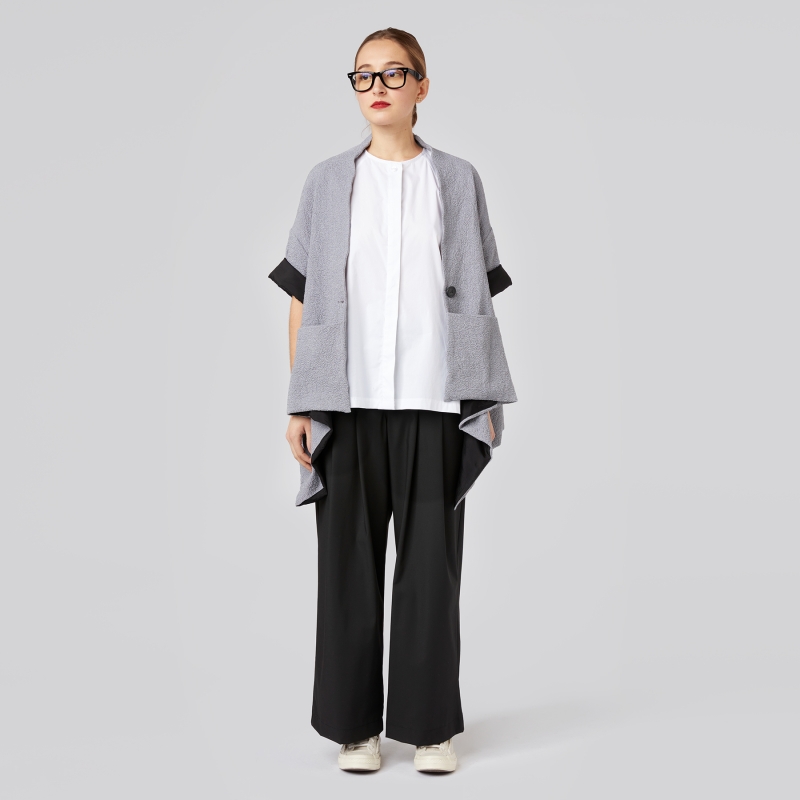 Pantalone palazzo con fascia elasticizzata sul retro e chiusura a zip con bottone sul davanti. Tasche frontali con pieghe. Passanti per cintura. Vestibilità comoda. ù