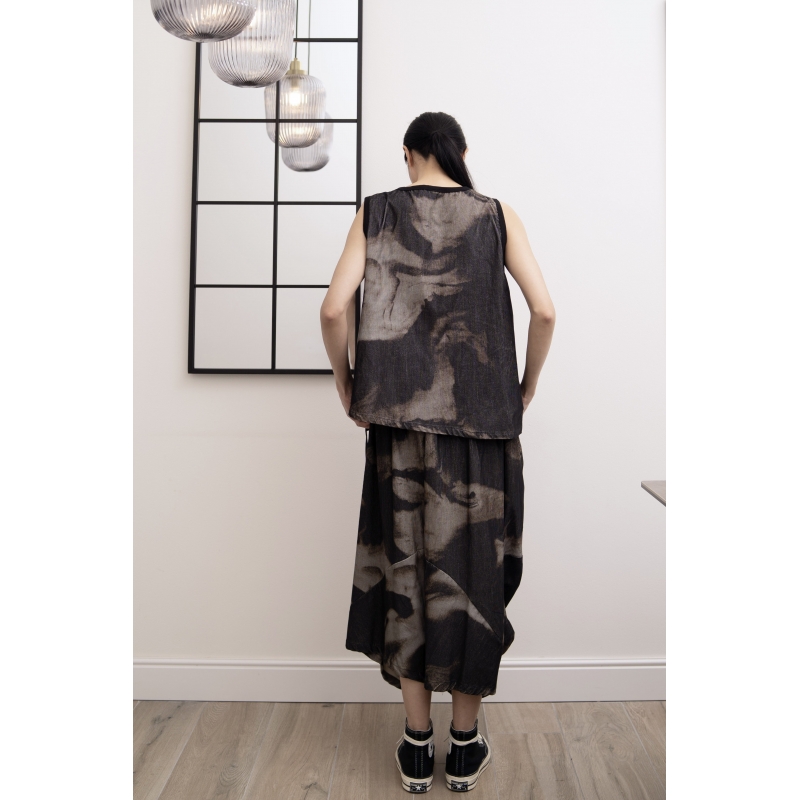 Pantaloni a costine di cotone con stampa sfumata. Fascia elasticizzata in vita con passanti per cintura. Tasche laterali inserite nel taglio. Piega frontale. Cavallo molto basso. Vestibilità larga e comoda.