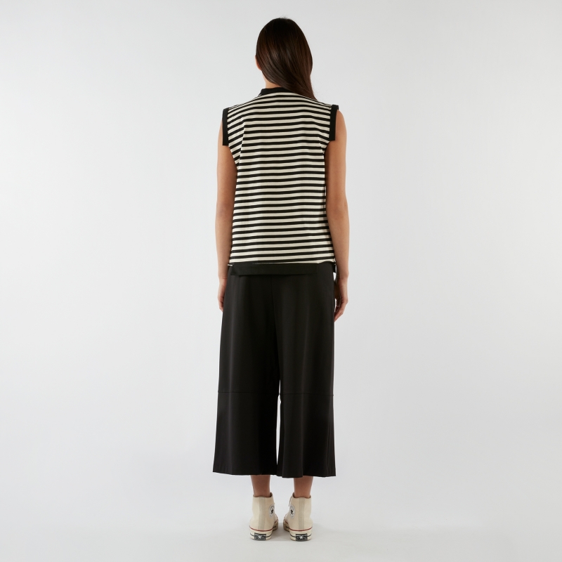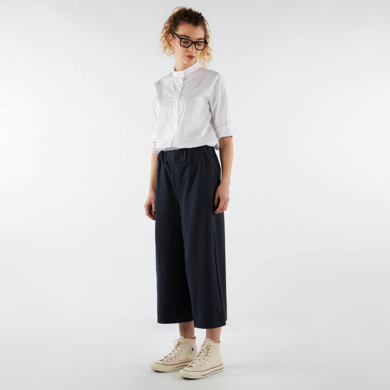 Pantaloni culotte in tessuto Punto Milano misto cotone elasticizzato. Fascia elasticizzata in vita. Dettaglio cucitura sotto il ginocchio. Gamba ampia. Comoda vestibilità.