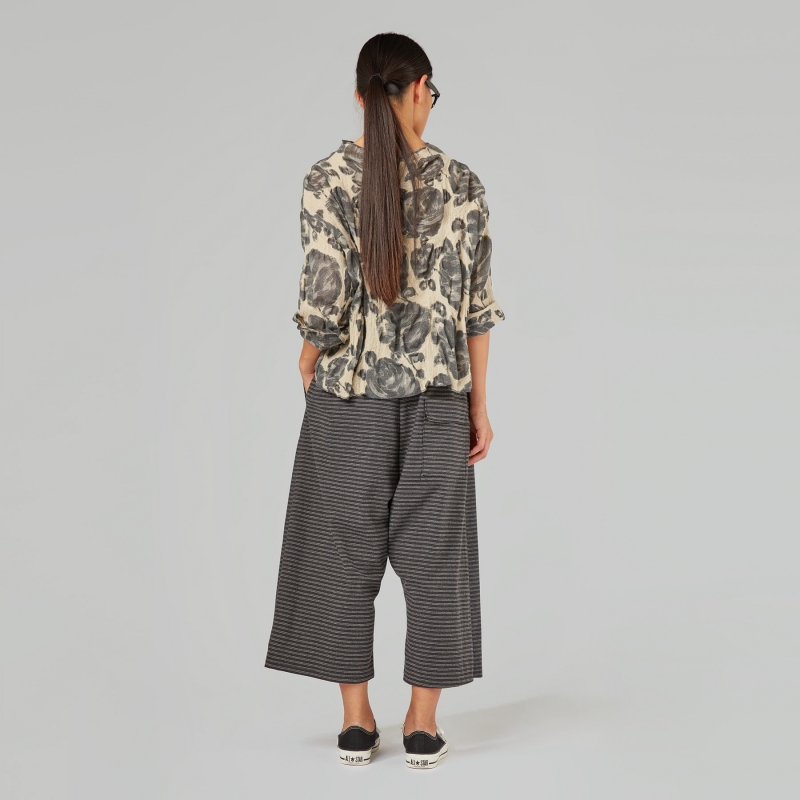 Pantalone a righe melange in tessuto misto cotone e viscosa. Fascia elasticizzata in vita. Tasche laterali a scomparsa. Tasca con patta sul retro. Cavallo basso. Vestibilità larga e comoda.