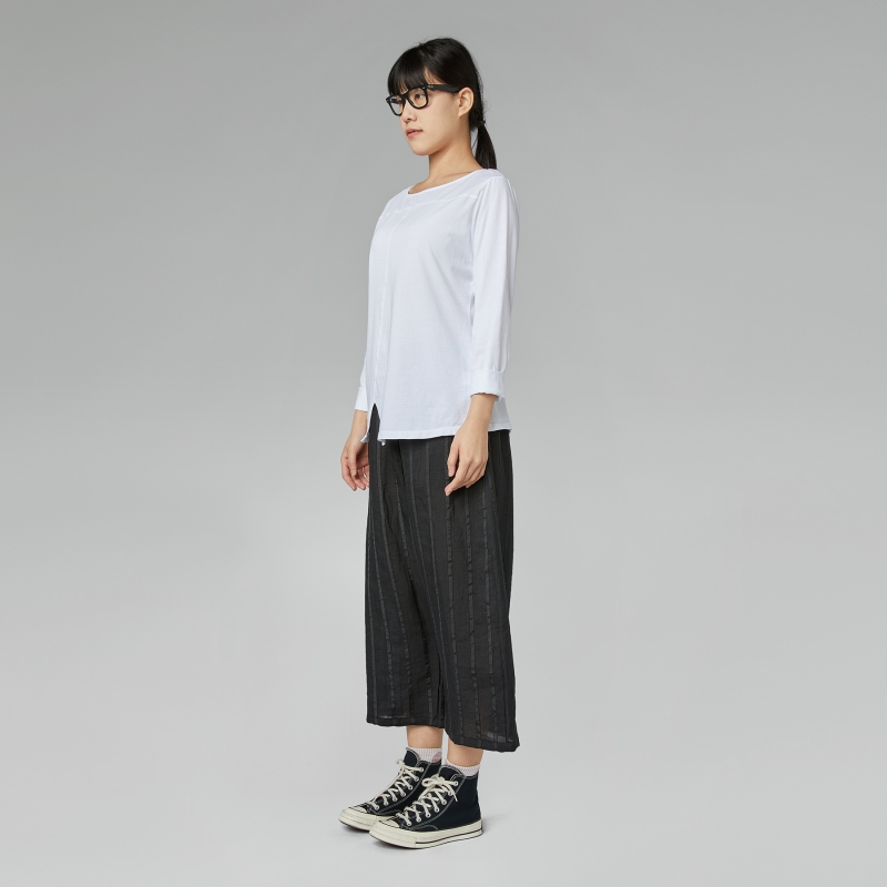 T-shirt con spacchetto davanti in jersey di cotone. Scollo rotondo. Spalla regolare e maniche lunghe.Taglio squadrato. Vestibilità ampia e comoda.