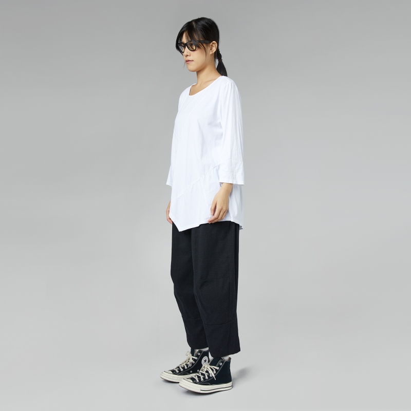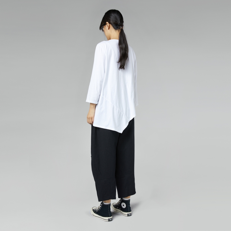 Maglietta asimmetrica in jersey di cotone. Scollo rotondo. Spalle regolari e manica lunga. Vestibilità comoda.