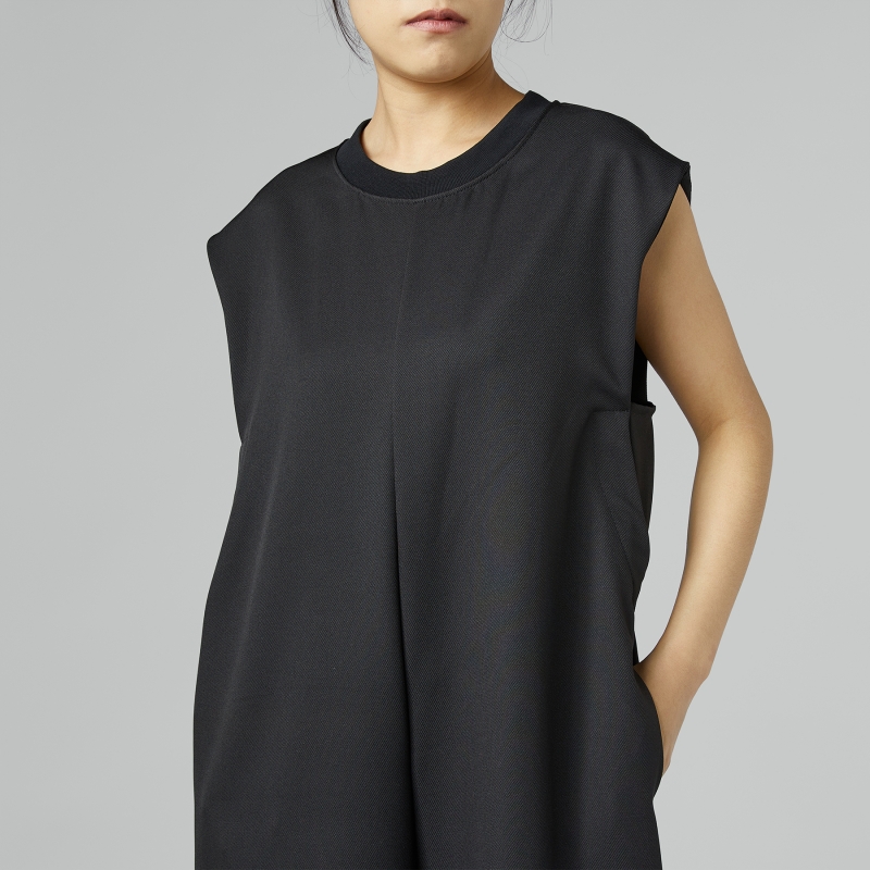 Tuta smanicata con chiusura a zip sul retro. Colletto tondo con elastico. Tasche laterali a scomparsa. Cavallo leggermente basso. Vestibilità comoda.